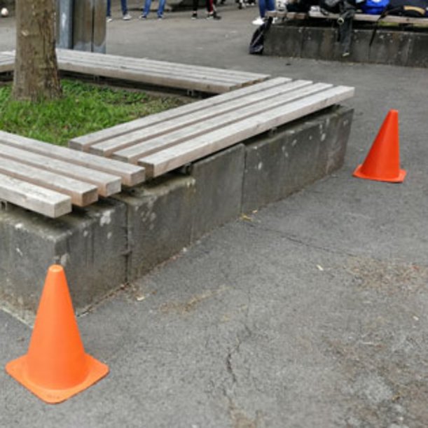 Auf fast jedem Schulhof befinden sich Bänke, die den Schülerinnen und Schüler für die Erholung in den Pausen zur Verfügung stehen. Da die Sitzgelegenheiten bei Übungen und Spielen eine Gefahrenstelle darstellen können, sollten sie vor dem Unterricht ausreichend abgesichert werden, z.B. mit Pylonen oder einem Flatterband.