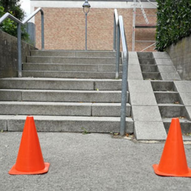 Auf einigen Schulhöfen befinden sich Treppen, z.B. als Eingang in das Schulgebäude. Damit die Treppen nicht zur Gefahr bei Übungen und Spielen werden, müssen sie entsprechend gesichert sein, z.B. mit Pylonen oder Flatterband.