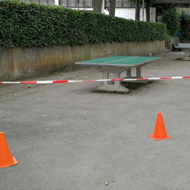 Auf vielen Schulhöfen stehen Tischtennisplatten, die für radfahrende Schülerinnen und Schüler eine Gefahr darstellen können, wenn sie nicht ausreichend abgesichert sind. Es empfiehlt sich, die Tischtennisplatten großräumig mit Flatterband abzugrenzen. Bei Bedarf können zur Absicherung auch noch Pylonen hinzugenommen werden.